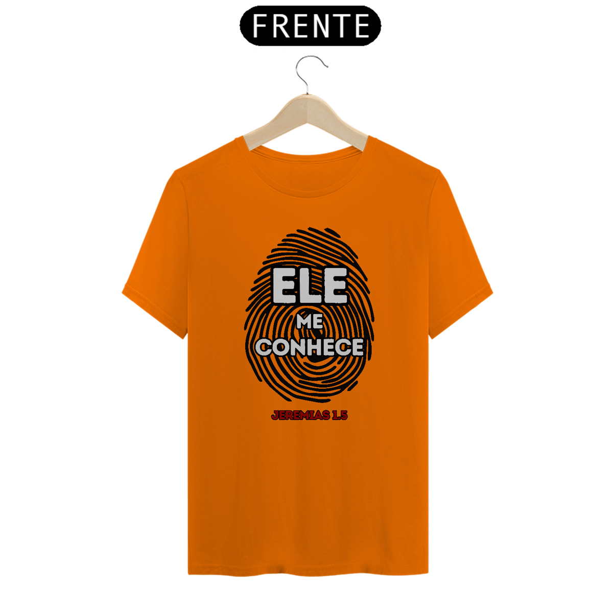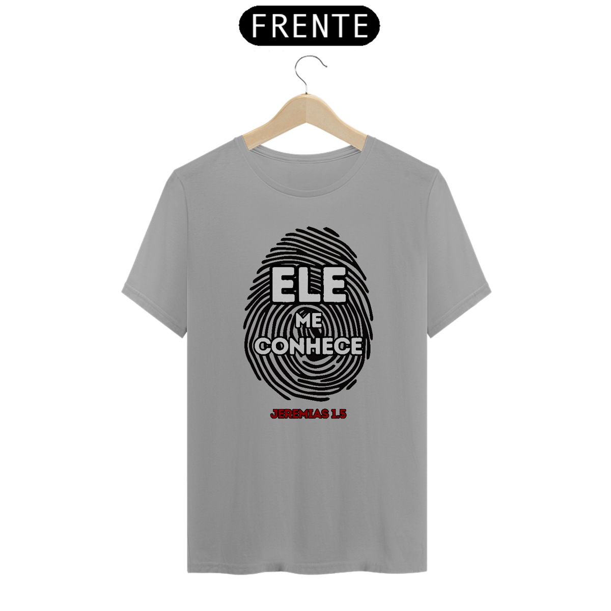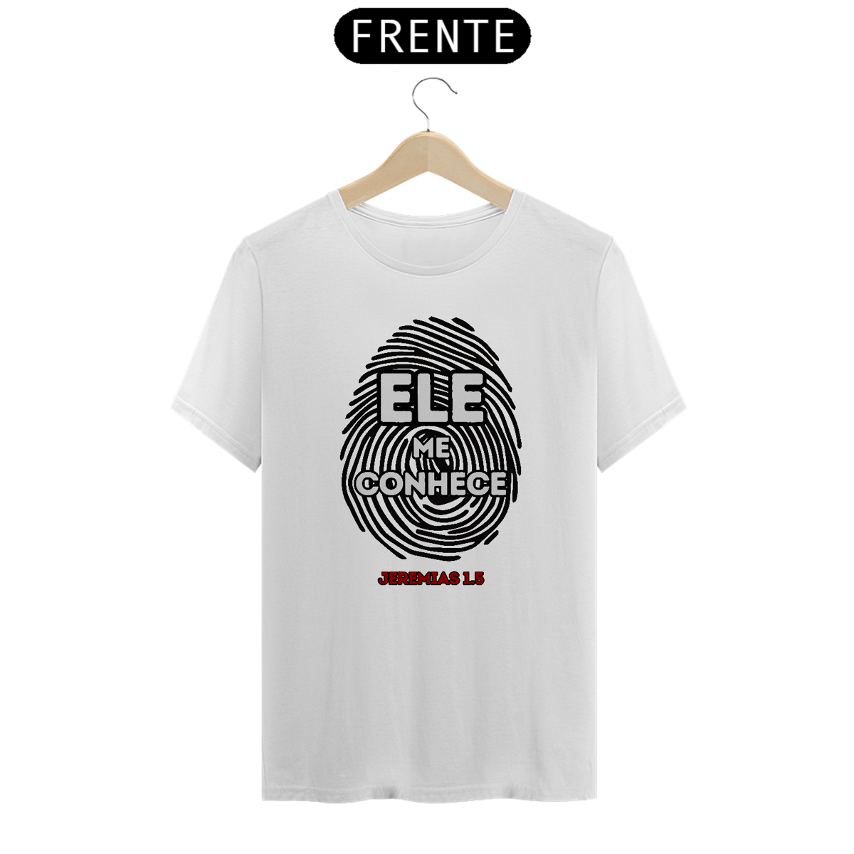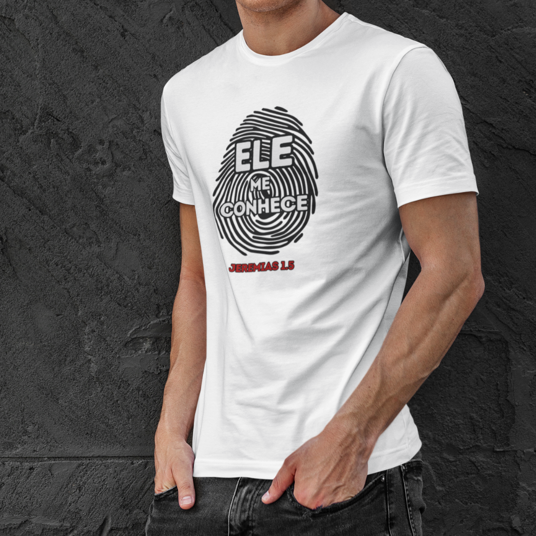 Camiseta com a mensagem "Ele me conhece", inspirada em Jeremias 1:5, que nos lembra que Deus nos formou, escolheu e conhece profundamente. Um símbolo de identidade e propósito em Cristo, perfeito para expressar sua fé com significado. Vista essa verdade e celebre o amor de Deus que te conhece desde sempre!