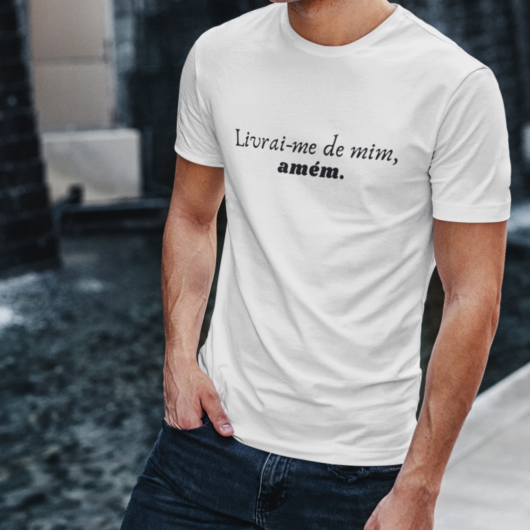Camiseta com a mensagem "Livrai-me de mim, amém", um poderoso clamor de rendição e busca pela transformação em Cristo. Um convite à humildade, pedindo a ajuda de Deus para superar nossas limitações e ego. Perfeita para quem deseja viver a graça divina e se entregar totalmente ao Seu plano.
