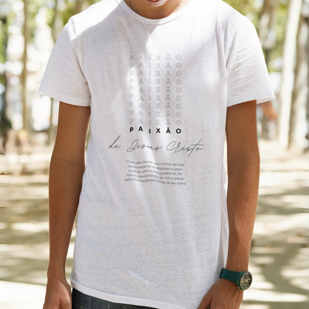 Camiseta com a mensagem "Paixão de Cristo", celebrando o sacrifício e o amor incondicional de Jesus na cruz. Um lembrete poderoso de Sua dor e redenção pela humanidade, oferecendo salvação. Perfeita para expressar sua fé e lembrar o verdadeiro significado da Páscoa. Vista essa mensagem de amor e esperança!