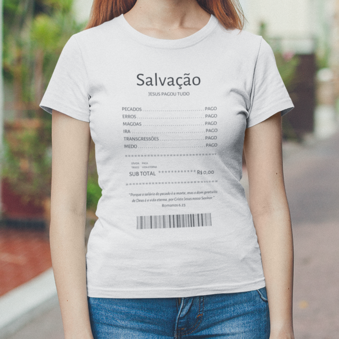 Camiseta inspiradora com a mensagem "Recibo da Graça", simbolizando que a salvação em Cristo é um presente gratuito, pago na cruz. Um lembrete poderoso do amor e misericórdia de Deus, perfeito para expressar sua fé com estilo. Vista essa verdade e compartilhe a graça divina por onde for!