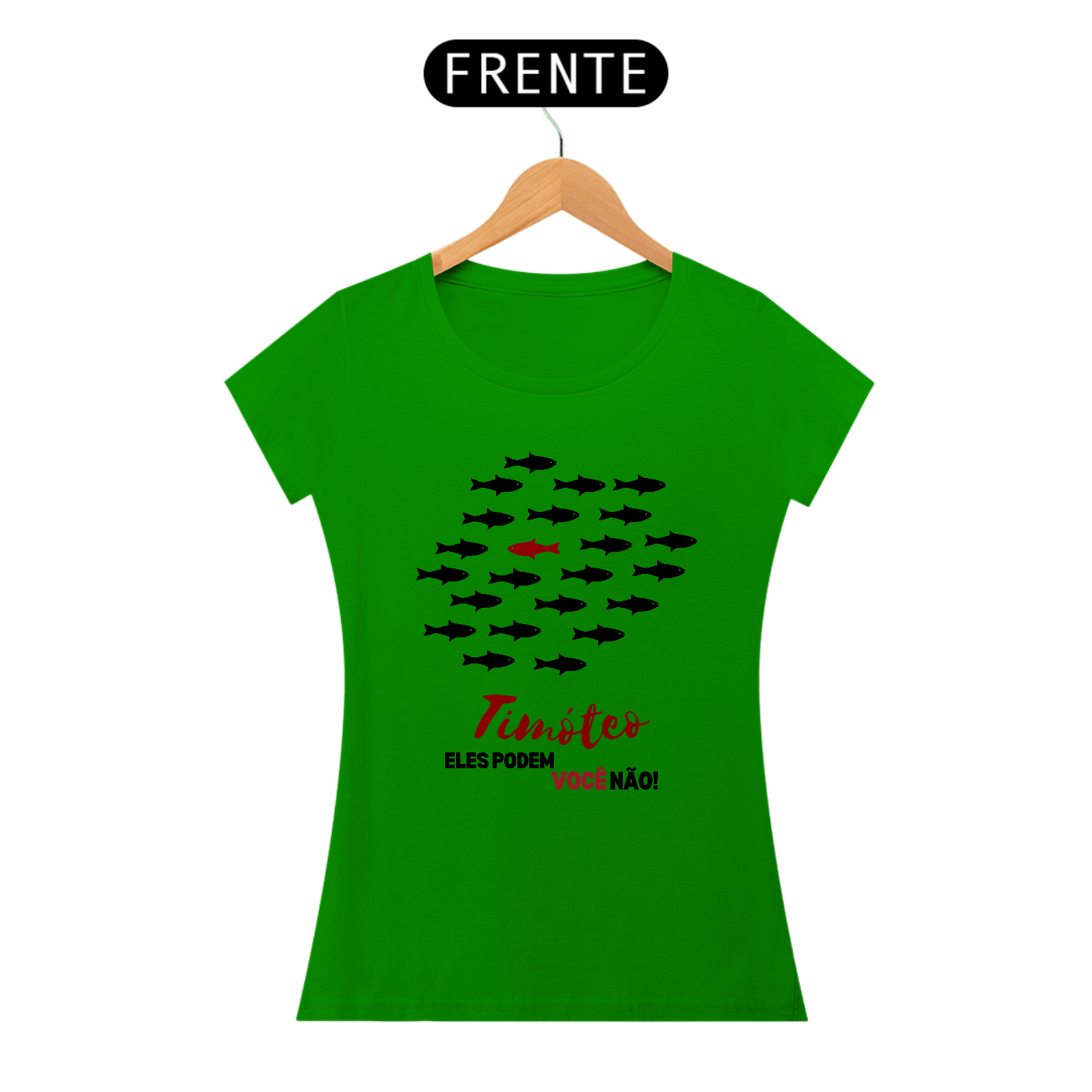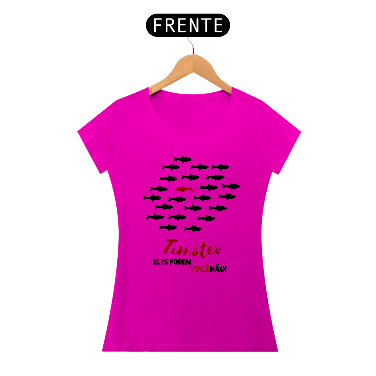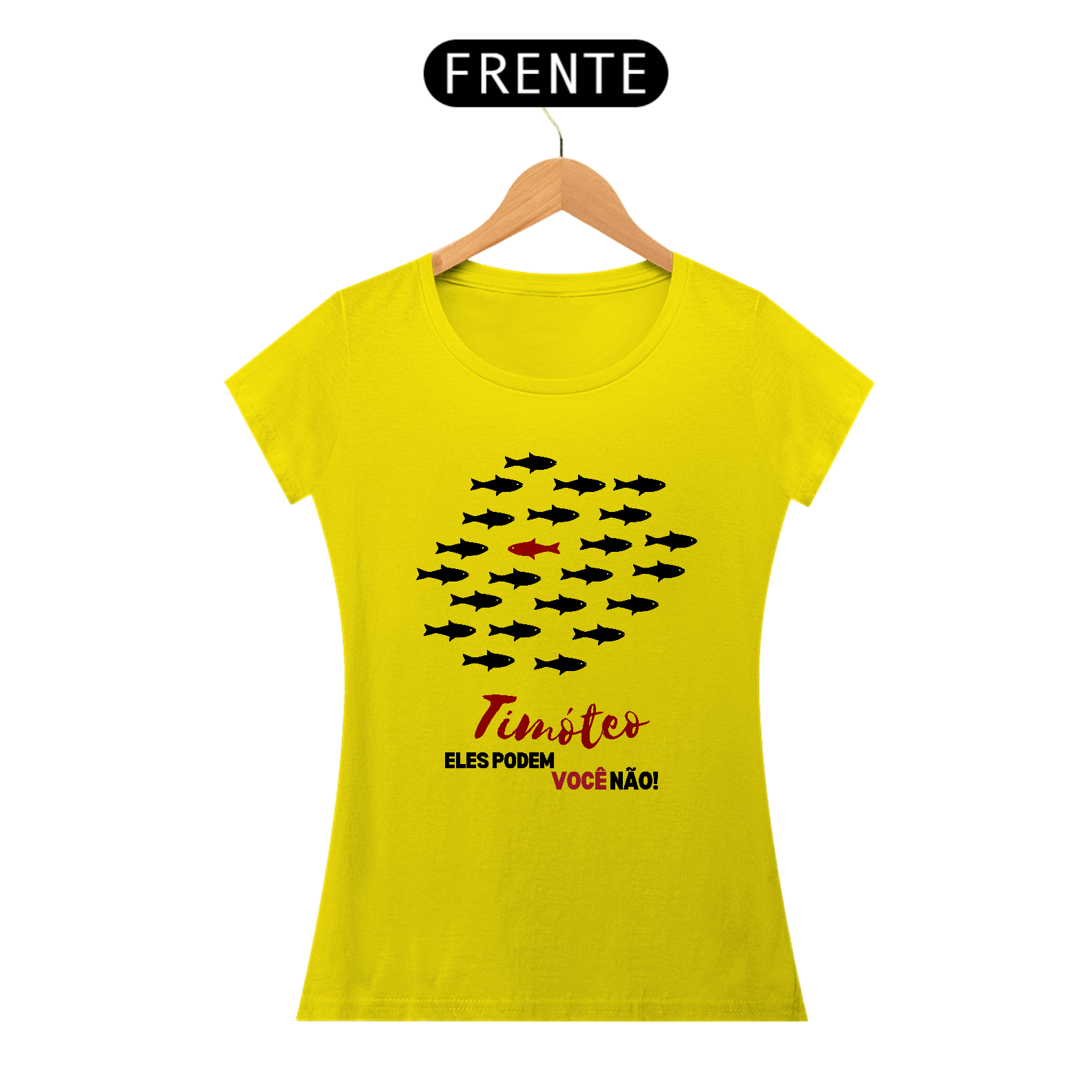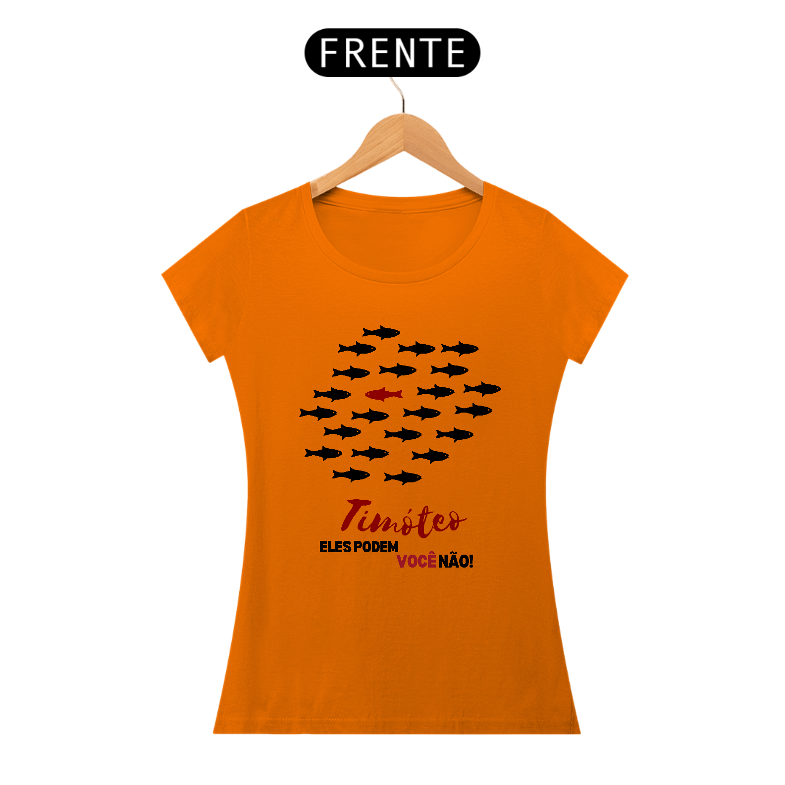 Camiseta "Timóteo, eles podem, você não!", inspirada nas cartas de Paulo a Timóteo, que chamam à santidade e fidelidade a Deus. A estampa mostra peixes seguindo o fluxo do mundo, enquanto um escolhido nada contra a corrente, simbolizando a vida separada em Cristo. Um lembrete de que quem é chamado para Deus vive diferente. Vista essa missão!